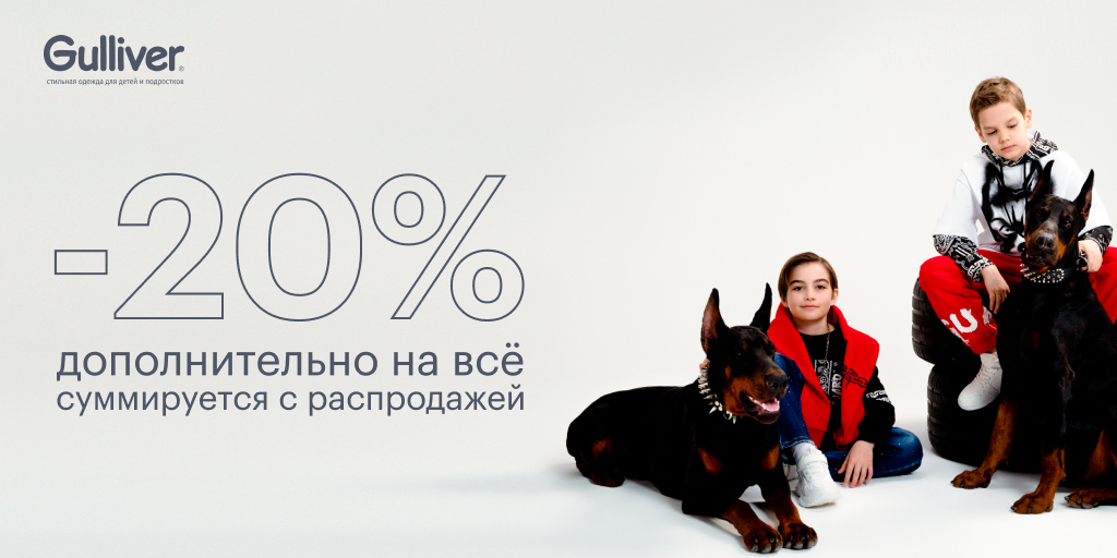 Успейте воспользоваться дополнительной скидкой 20% на всю детскую одежду Gulliver, кроме новой коллекции SS2024−25. Скидка суммируется с межсезонной распродажей, но не суммируется со скидками по картам лояльности.