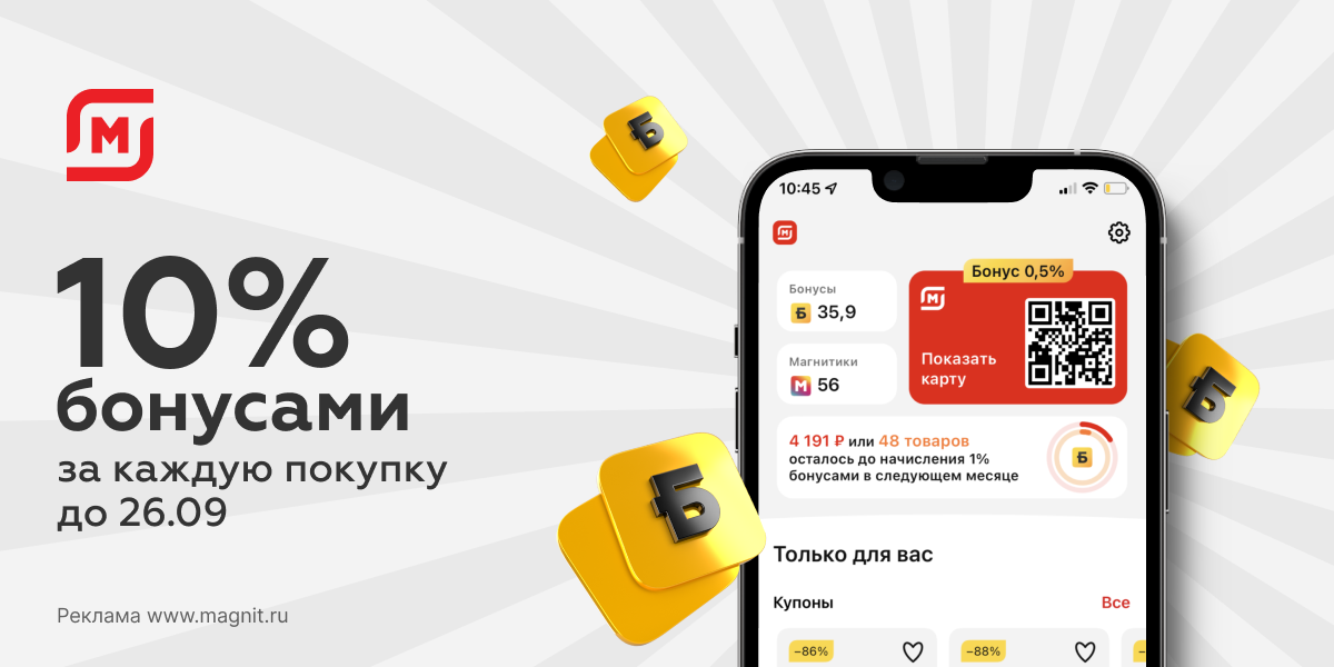 Совершайте покупки с картой Магнит и получайте кешбэк 10% за каждую покупку до 26 сентября.