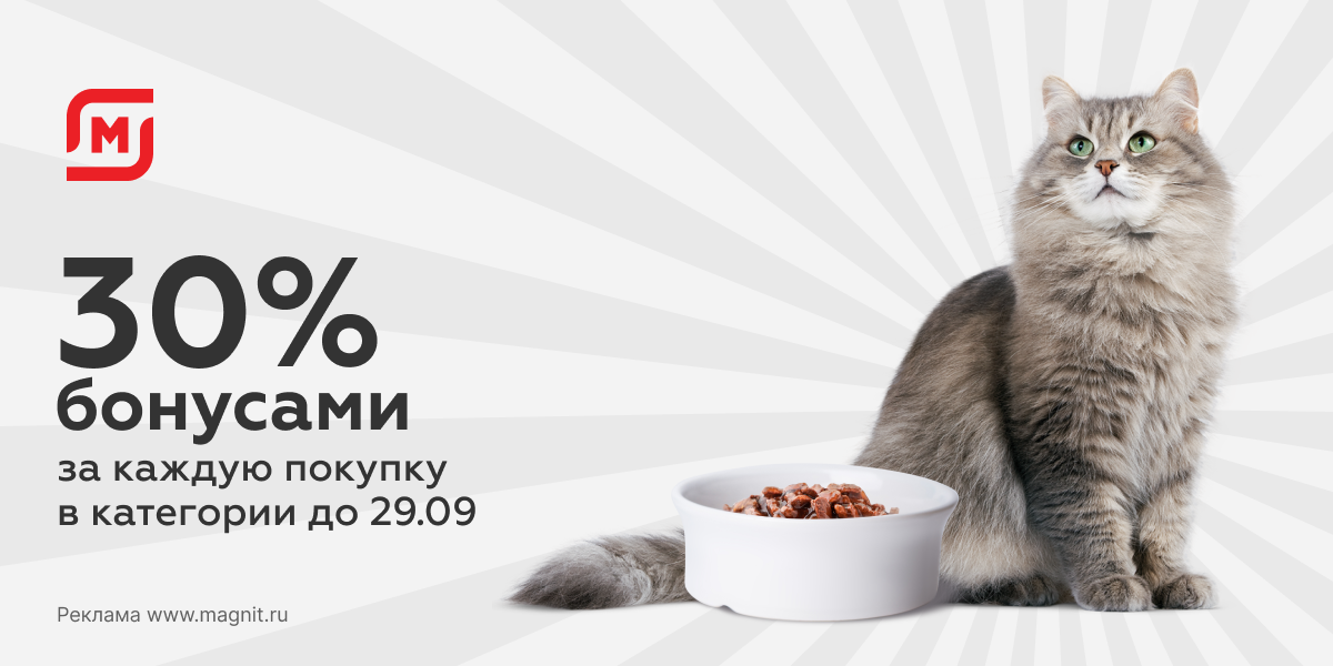30% кешбэка ещё ближе: до 29 сентября покупайте влажные корма для кошек и котят с белыми ценниками в Магнит и получайте повышенный кешбэк бонусами.
