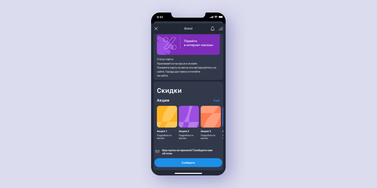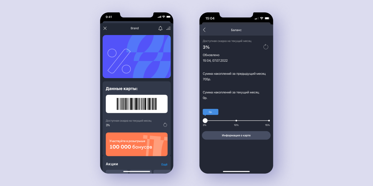 Баланс бонусных баллов На экране карты можно следить за статусом в программе лояльности — копить или списывать бонусы, наблюдать за текущим процентом скидки и количеством бонусов, а также датой их сгорания.