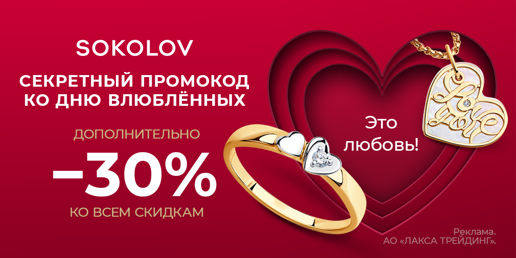 Акция проводится с 09:00 09.02.2023 по 12:00 12.02.2023 по московскому времени в интернет-магазине sokolov.ru и мобильном приложении бренда. Организатор – АО «ЛАКСА ТРЕЙДИНГ». Юридический и фактический адрес: 129343, г. Москва, проезд Серебрякова, д. 4 стр. 1, офис 204, ИНН 7716951970, ОГРН 1207700478259.