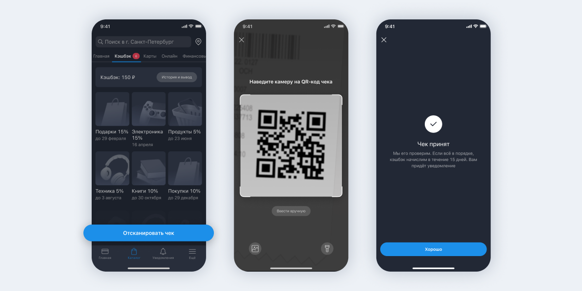Готово! После обработки чека вы получите кэшбэк на счёт в приложении. Как только накопите 500₽, их можно выводить на карту российского банка.