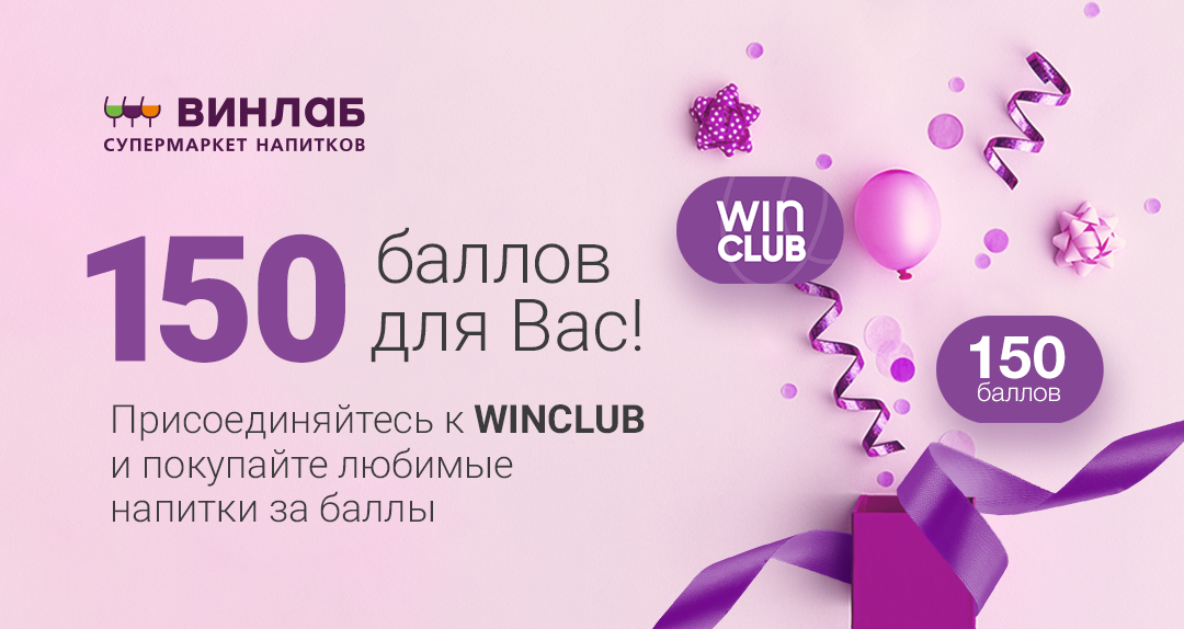 150 баллов уже на вашем счету! Покупайте любимые напитки и копите баллы с программой лояльности WinClub. Накопленными баллами можно оплатить до 70% покупки, 1 балл = 1 ₽.